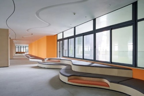 教室是标准化的典范,入门处墙体采用内凹设计,避免门的开合影响走道行人,充分体现了人文关怀。教室内预留了入墙式储藏柜,保证收纳的同时也能保证教室干净整洁。灯光和桌椅的排列方式也充分考虑了未来变换桌椅组合形式时的照度问题。走廊天花以白色为主,仅在形式上做简单变化,既能呼应地面颜色,增添趣味性,也能保证跟建筑整体砖红色完美搭配。