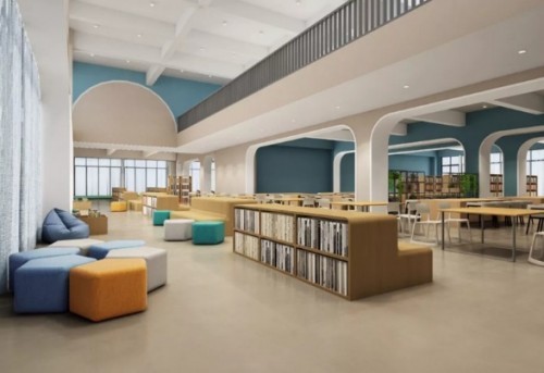 图书馆分为陈列区、阅览区、服务区三大块,在标准化的书架陈列之外,设计以极具弧线美感的列阵与半围合相互搭配,灯带走向对应动态流线,个性化的布局方式成为空间的一大亮点。蓝色、绿色等颜色的视觉观感清新而静宁,能让学生更高效地进入学习氛围,提高阅读效率。