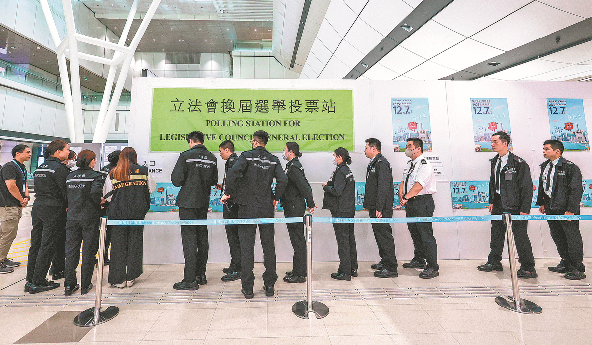 Staff members of the Immigration Department of Hong Kong Special Administrative Region line up on Sunday to enter a polling station at the Hong Kong International Airport to cast their ballots for the election of the eighth-term Legislative Council of the SAR. ANDY CHONG/CHINA DAILY