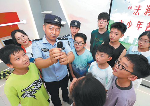 A police officer explains telecom and online fraud prevention to children, using a smartwatch as an example. XINHUA