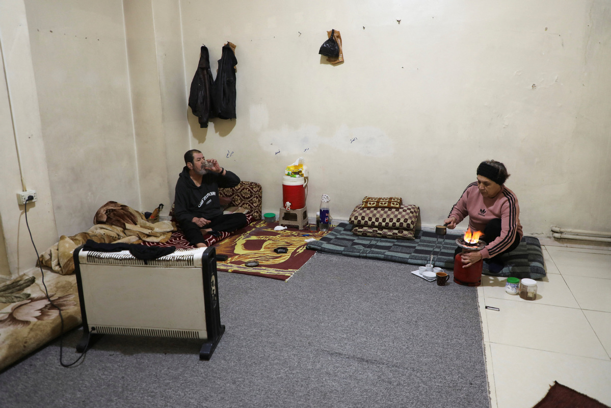 Displaced Kurdish Syrians Horo Mamdouh and his wife Mayada Kor Misto, sit inside a shelter in Qamishli, Syria, Dec 8, 2025. [Photo/Agencies]