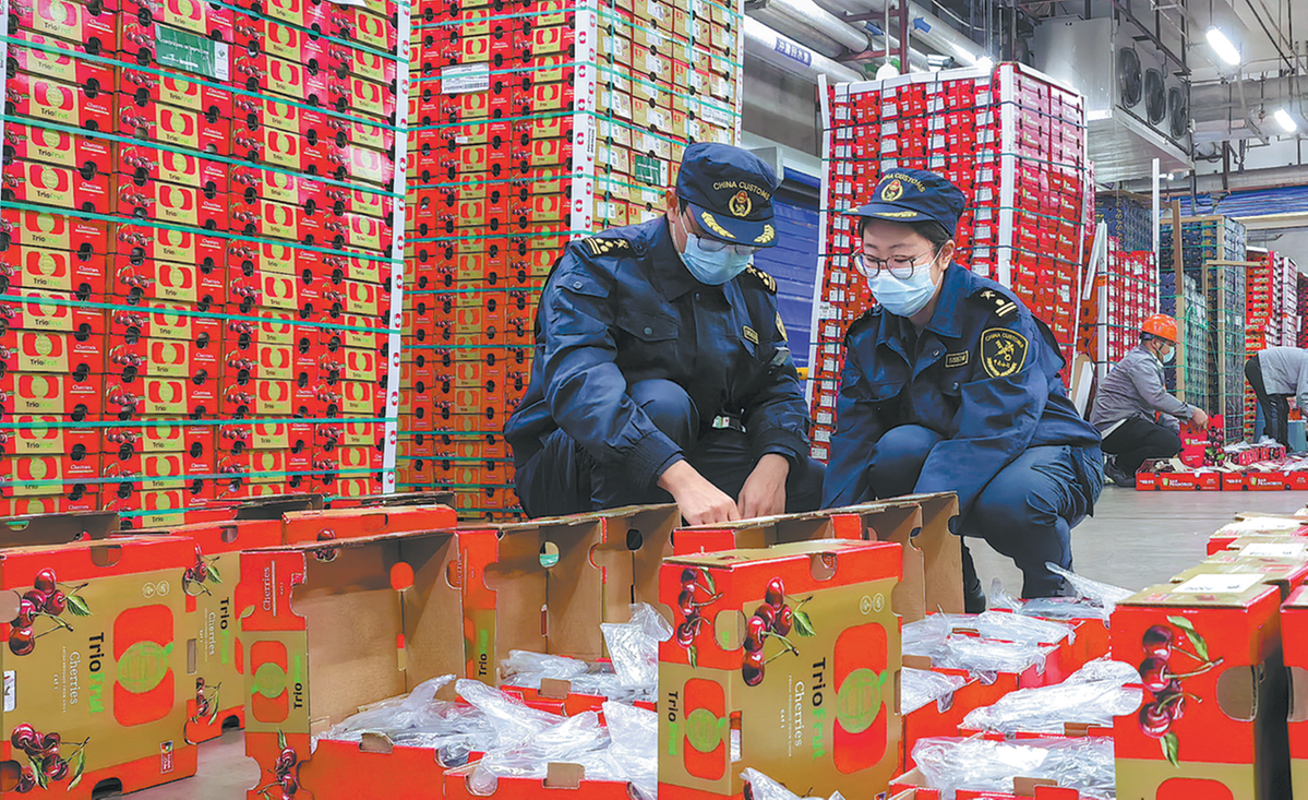 Customs officials check imported cherries in Guangzhou's Nansha port, Guangdong province, on Saturday. XINHUA