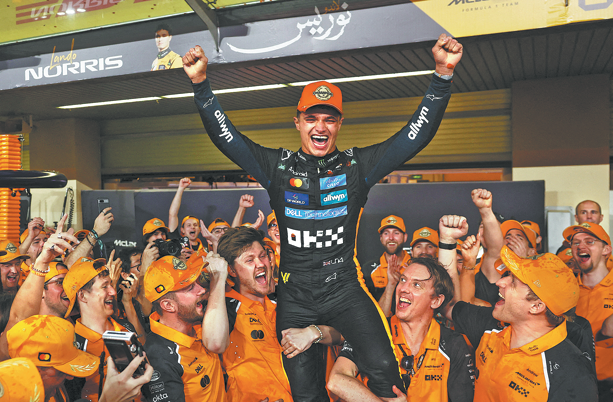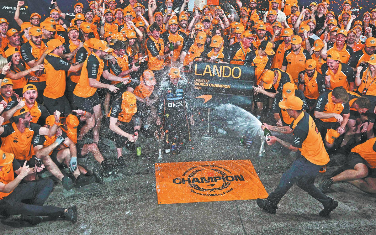Lando Norris celebrates with his team after winning the 2025 Formula One world championship on Sunday. REUTERS