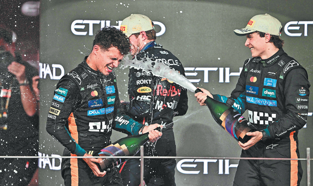 Norris (left) celebrates with Max Verstappen (center) and Oscar Piastri on the podium on Sunday. AFP