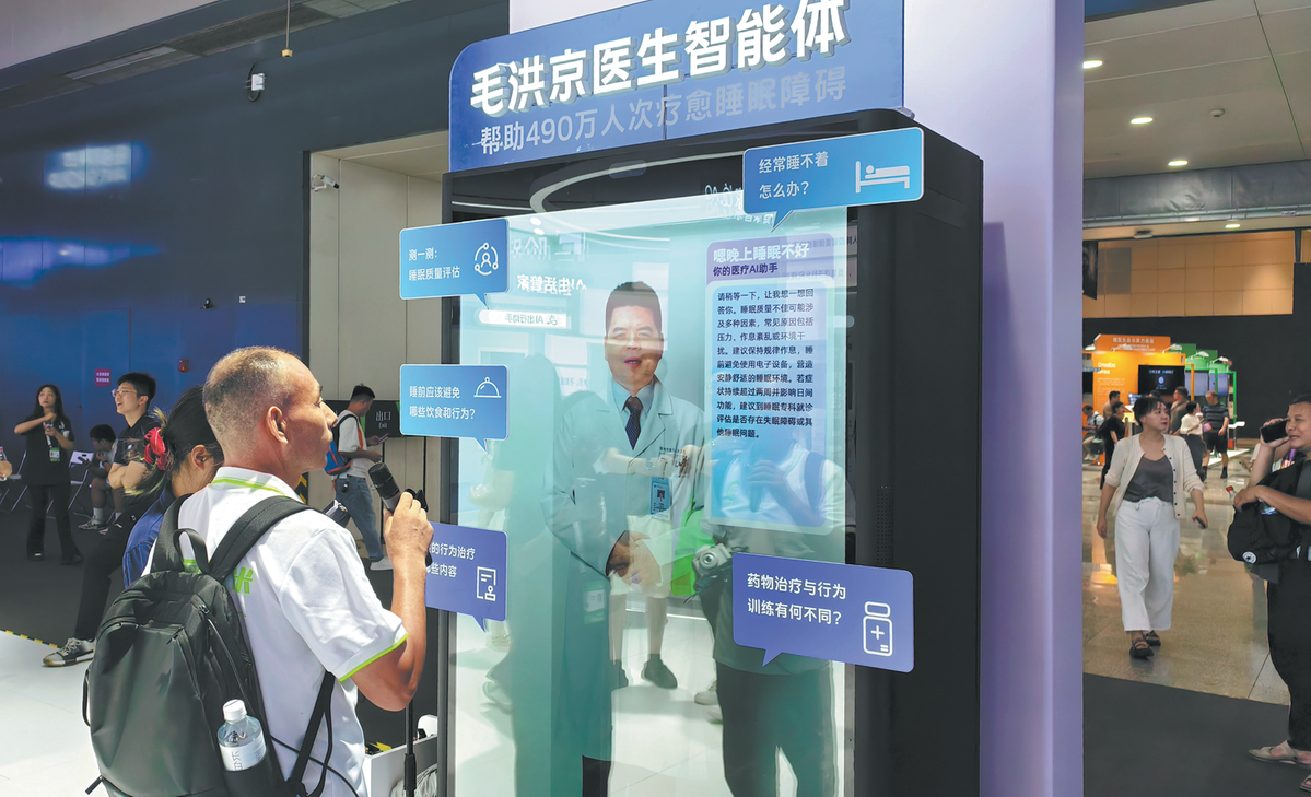 A visitor engages in a conversation with an AI sleep health management expert about the recovery process for sleep disorder conditions during the 2025 World Artificial Intelligence Conference in Shanghai on July 29. CHEN YUYU/FOR CHINA DAILY
