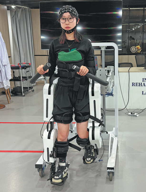 A laboratory member of Tianjin University debugs a brain-computer interface lower-limb wearable device designed to assist in stroke patients' recovery in Tianjin on April 1. ZHANG YUQI/XINHUA