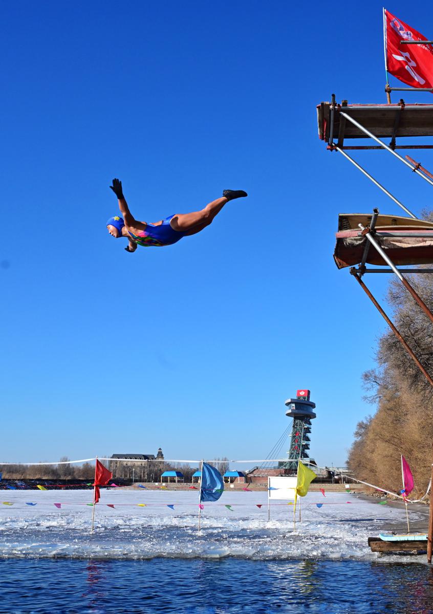 A winter swimmer jumps into the icy Songhua River from a 4-meter-high diving platform in Harbin, Heilongjiang province. [Photo by Yang Wei for chinadaily.com.cn]