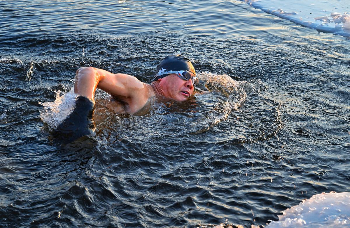 A winter swimmer braves the frigid waters of the Songhua River in Harbin, Heilongjiang province. [Photo by Yang Wei for chinadaily.com.cn]