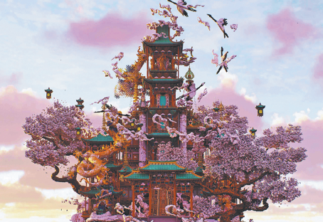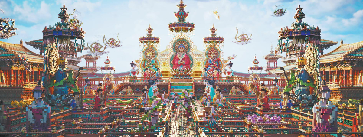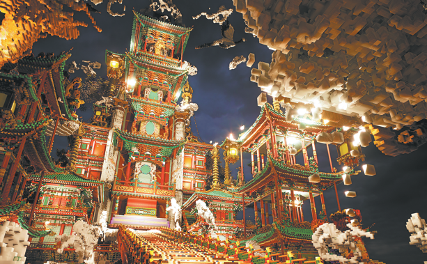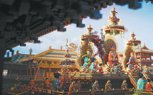 An image of the Dunhuang-themed landscape restored by Xia Caiquan in the game Minecraft shows the heavenly palace of Buddhism. CHINA DAILY