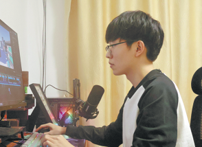 Qiu Zekai points to his work on the desktop screen. CHINA DAILY