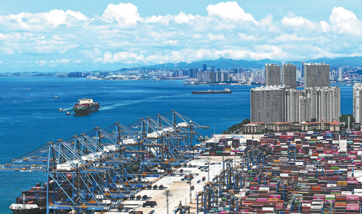 An aerial drone photo taken on July 8 shows a containership approaching Qingdao Port in Qingdao, Shandong province. TAO LIANG/XINHUA