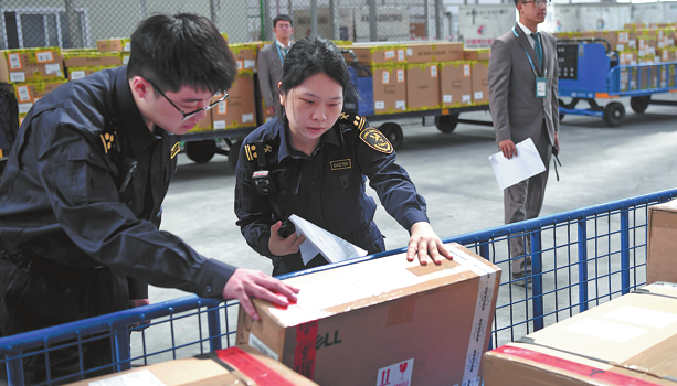 Customs officials inspect and clear the first batch of zero-tariff imported goods on Thursday at Sanya Phoenix International Airport in Sanya, Hainan province. ZHAO YINGQUAN/XINHUA