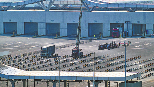 Trucks carrying the first batch of goods that completed customs clearance to enter China's mainland are seen on Thursday at a centralized inspection area for Xinhai Port and Nangang Port in Haikou, Hainan province. JIANG JURONG/FOR CHINA DAILY