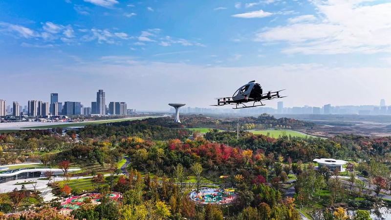 An undated aerial drone photo shows an electric vertical take-off and landing vehicle performing flight demonstration at Luogang Park in Hefei, East China's Anhui province. [Photo/Xinhua]