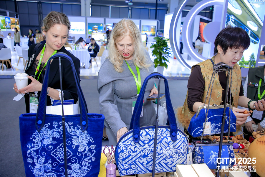 International travel agents view Chinese handicrafts at the exhibition of the China International Travel Mart 2025, in Haikou, Hainan province, on Dec 19. [Photo provided to chinadaily.com.cn]