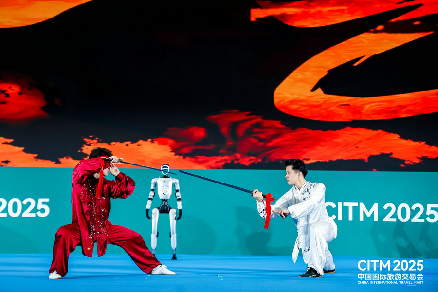 A humanoid robot joins a performance during the opening ceremony of the China International Travel Mart 2025 on Dec 19. [Photo provided to chinadaily.com.cn]