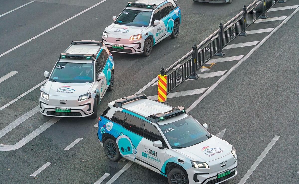 A queue of robotaxis from Chinese autonomous driving company Pony.ai navigates public roads in Guangzhou, Guangdong province, on Dec 6. QIN ZIHANG/FOR CHINA DAILY