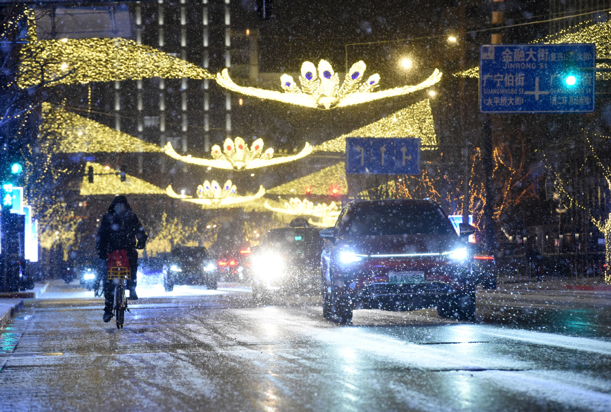 Vehicles drive amidst snowfall in Beijing, capital of China, on Jan 17, 2026. Beijing witnessed a snowfall on Friday. [Photo/Xinhua]