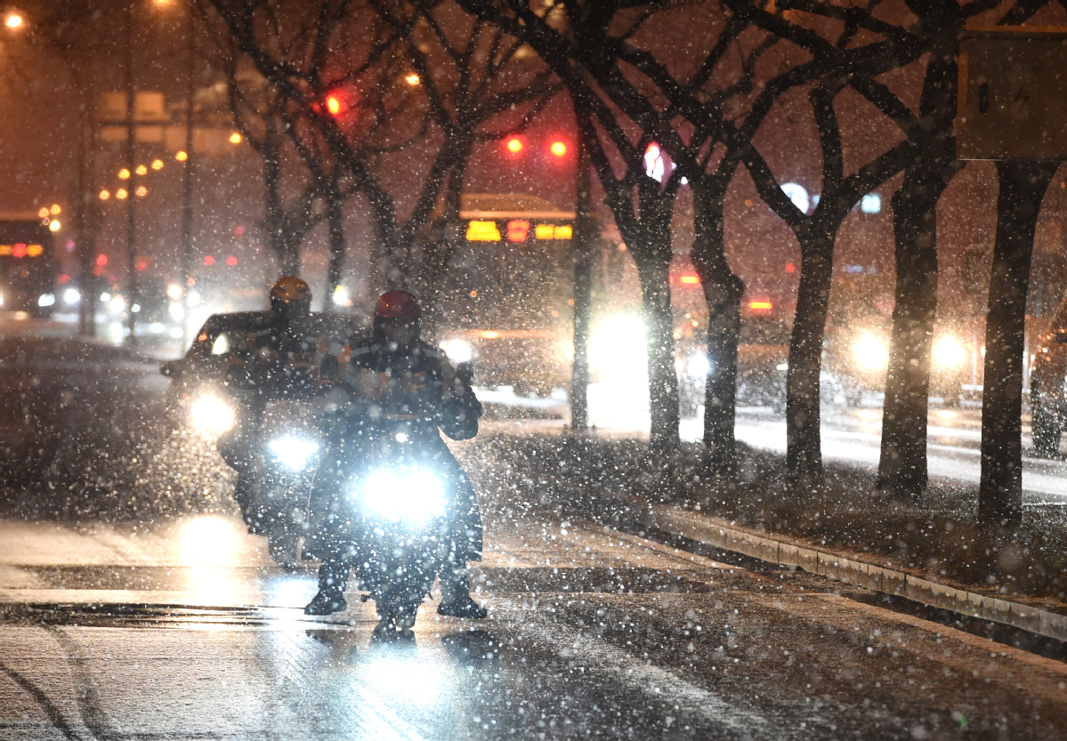 A deliveryman works amidst snowfall in Beijing, capital of China, on Jan 17, 2026. Beijing witnessed a snowfall on Friday. [Photo/Xinhua]