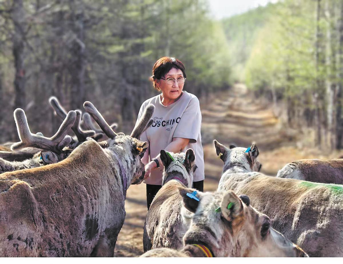 Dekesha Kaertakun tends to reindeer in Olguya town of Genhe, Inner Mongolia autonomous region. Yiqie Kaertakun/For China Daily