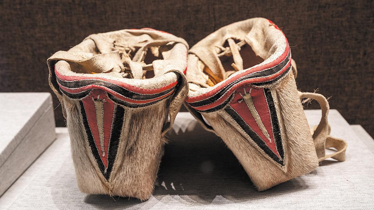 Boots of Ewenki style are on display at the museum. WANG YONGJIE/FOR CHINA DAILY