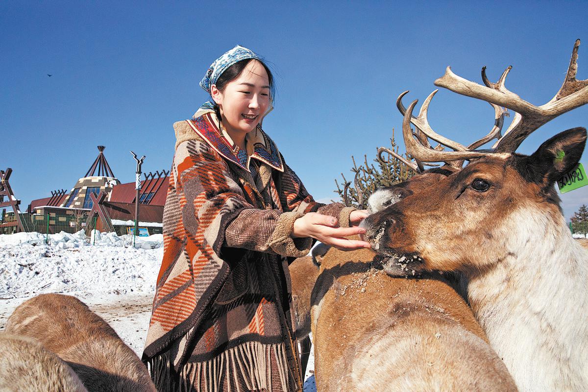 Youta Kaertakun feeds reindeer at Olguya town in Genhe, Inner Mongolia autonomous region. China Daily