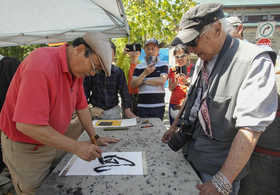 People watch Chinese calligraphy demonstration during the 21st Chinatown Festival in Vancouver, British Columbia, Canada, on July 15, 2023. [Photo/Xinhua]