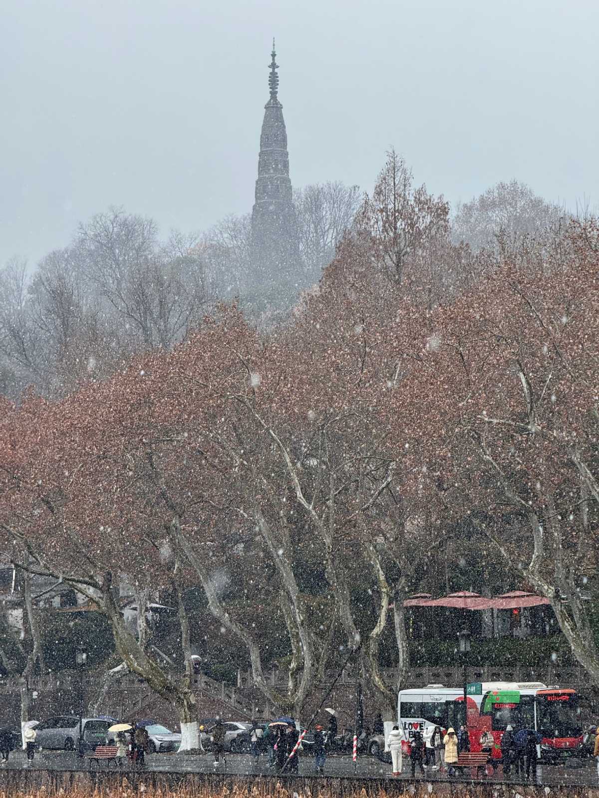 Snowflakes began falling around 8:00 pm in the mountainous areas. By 6:00 am on Tuesday, light snow was observed along the shores of West Lake, and steadily falling flakes reached the city center at 8:45 am, creating a rare winter spectacle in a city typically known for mild winters.