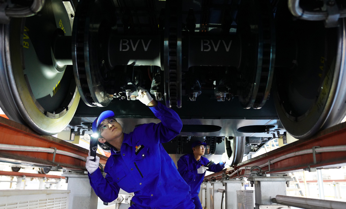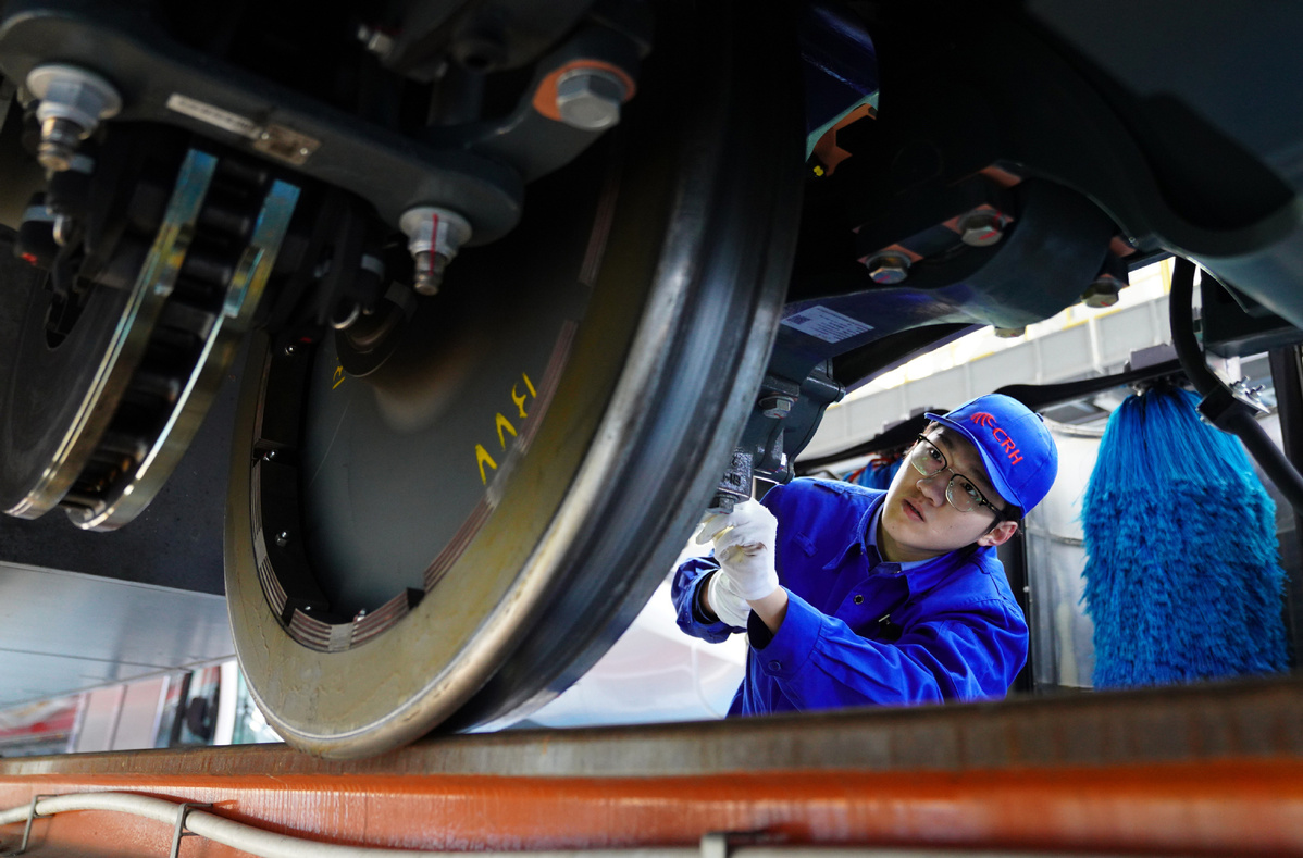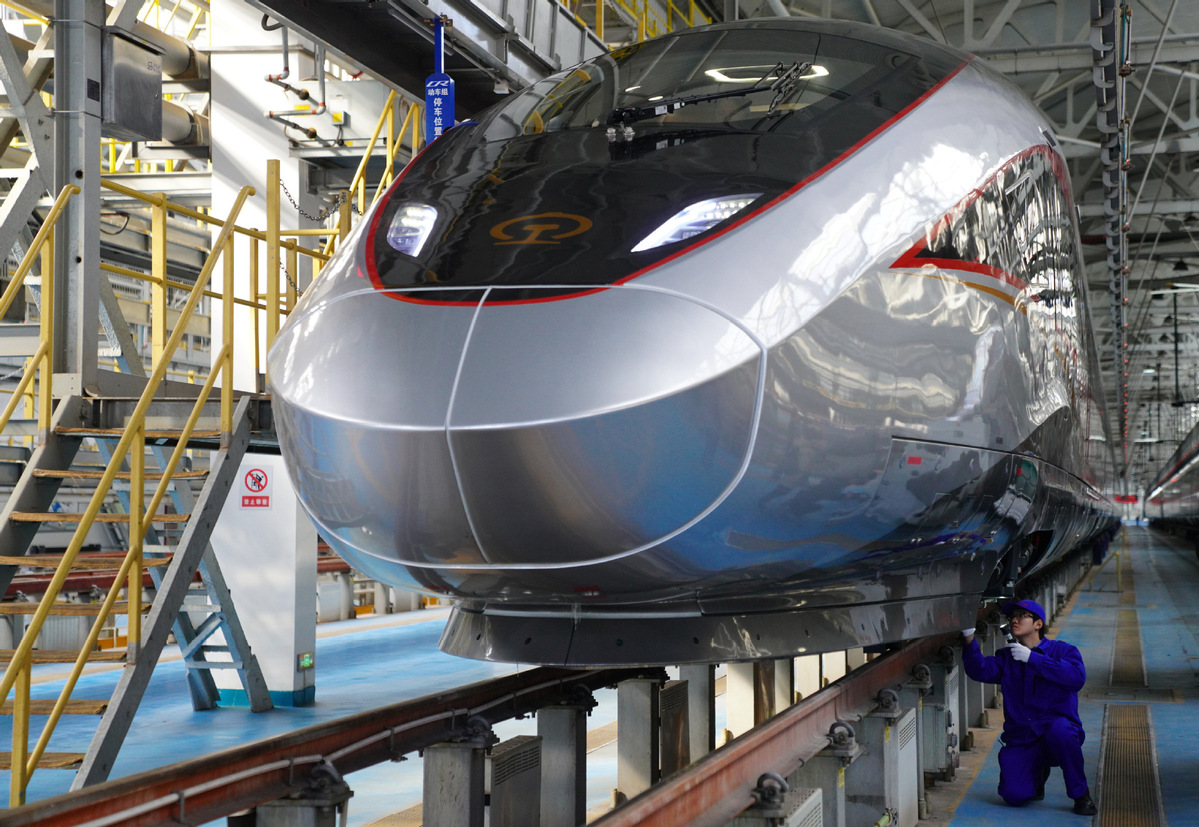 A staff member conducts maintenance work at a high-speed train base in Beijing, capital of China, Jan 20, 2026. With the approach of the Spring Festival, high-speed train staff members in Beijing are engaging in busy preparations to better serve the Spring Festival travel rush. [Photo/Xinhua]