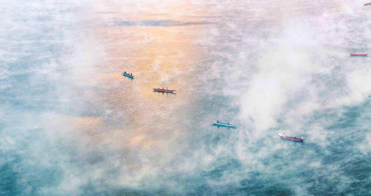 Amidst the ethereal morning fog, local Mosuo ethnic people paddle their traditional dugout canoes while singing mountain songs.