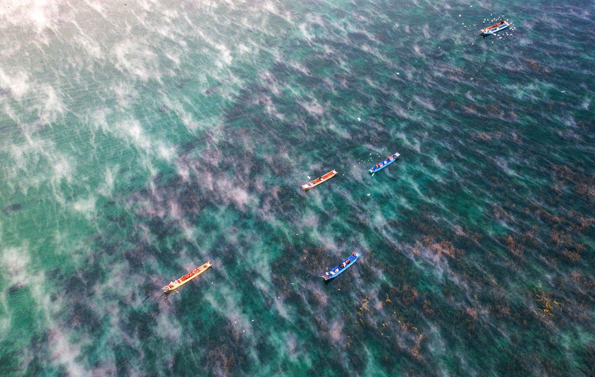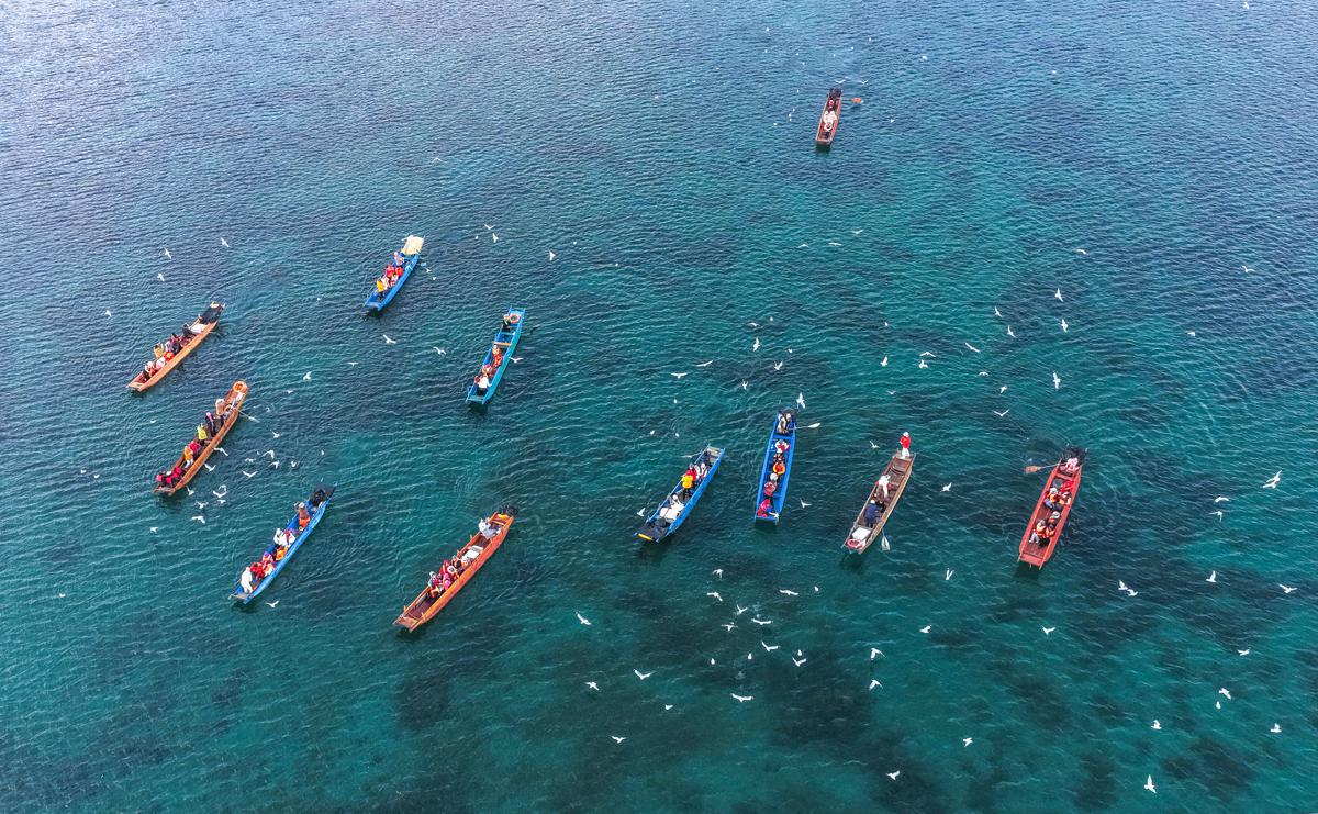 Local Mosuo ethnic people paddle dugout canoes, offering visitors an immersive experience at Lugu Lake in Lijiang, Yunnan province. [Photo by Chen Fei/For chinadaily.com.cn]