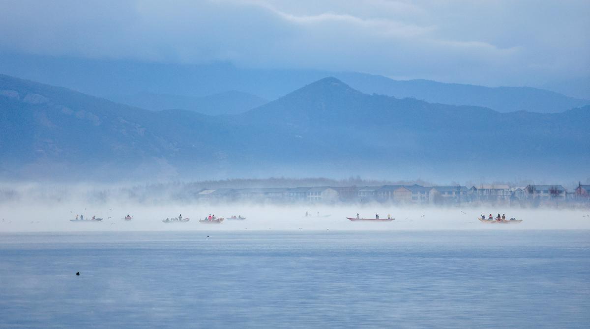 A light winter mist often settles over Lugu Lake in Lijiang, Yunnan province, as the highland lake and surrounding mountains slowly emerge at dawn.