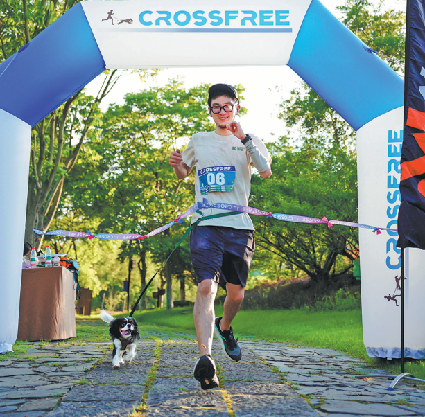 A contestant and his dog cross the finish line during Patago's Canicross event in Nanjing, Jiangsu province, in June. CHINA DAILY