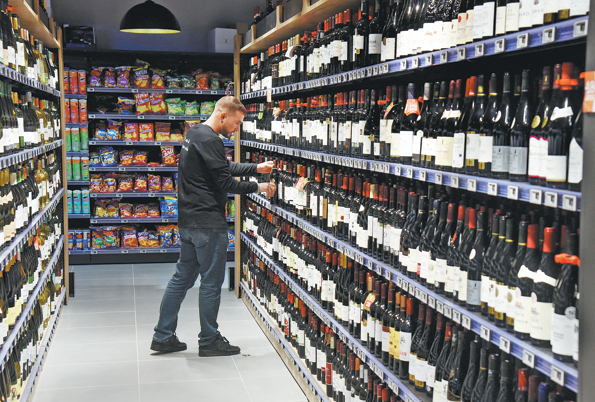 A shopper examines bottles of wine at a supermarket in Paris on Sept 5. APAYDIN ALAIN/NEWSCOM