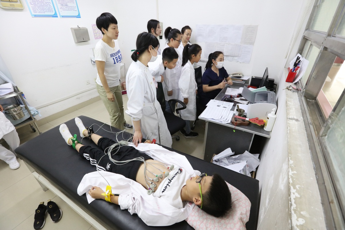 张伶筠护士长首先向小观察团员介绍了医院开展“看病不求人”活动以来的相关举措,然后带领观察员从网络服务平台到现场自助挂号,从一站式综合服务平台到临床医生现场诊疗,从穿越熙熙攘攘的门诊大厅到宁神静观心电图、真实体验“心动”的感觉,从血标本采集到全副武装、一站站全程跟踪到检验报告的生成,从旁听康复科训练师上课到被“特殊课堂”深深地吸引。