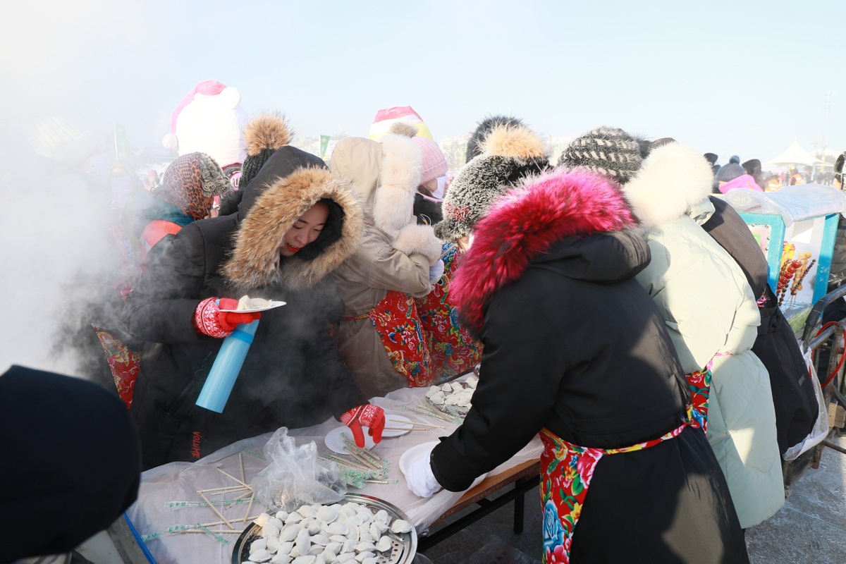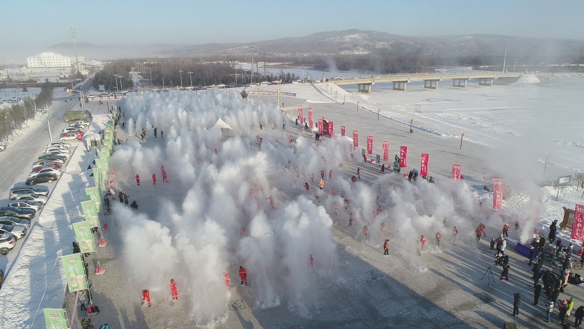 冬至这一天,神州北极漠河气温降至零下四十度左右。作为大兴安岭地区“万人泼水成冰”的主会场,漠河市上千名市民和游客相聚在冰雪户外,支起铁锅、煮起水饺,吃过热气腾腾的东北水饺过后,大家纷纷拿起水杯、水瓢,舀起滚烫的“饺子汤”,在广场上摆出一个大大的“北”字,随着主持人一声令下,大家同时将“饺子汤”用力泼向空中,一团团白雾腾空而起,队伍上空瞬间出现一大片云朵,场面气势恢宏,远远望去,十分壮观。四川的游客杨显玉兴奋的说,第一次跟这么多人一起玩“泼水成冰”,而且泼的还不是水,是煮饺子的汤,泼出去以后能听到热水结冰的声音,还能闻到饺子的香味,真是一种难忘的体验,一点都没玩够呢。