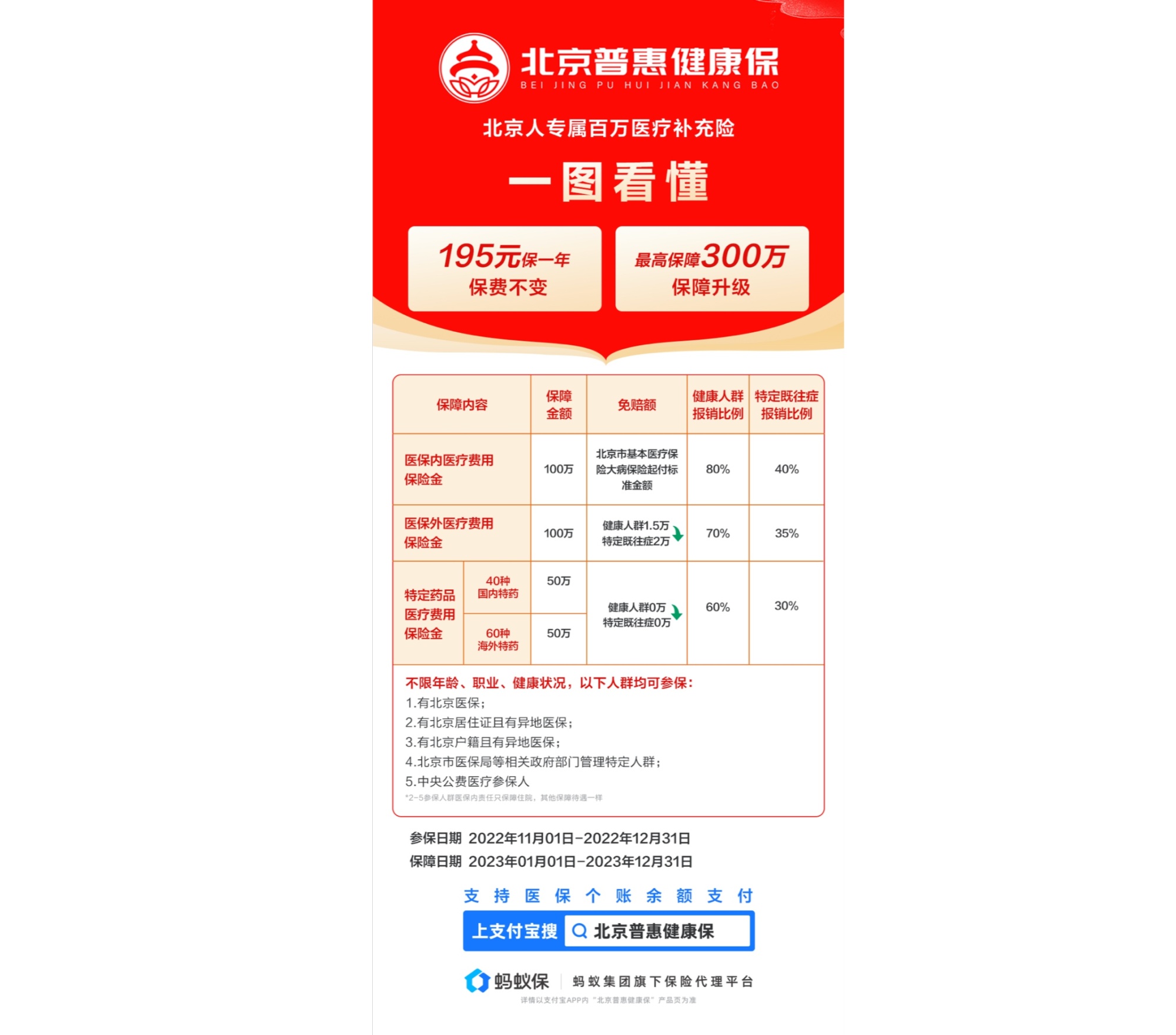11月1日,由北京市医保局、北京市金融监管局共同指导,北京银保监局监督的2023年“北京普惠健康保”正式开售。在保费不变的基础上,支持医保个人账户余额缴费,还伴有多项升级:一是扩大参保人群,北京新市民今年也能参保;二是下降多个责任免赔额,特效药责任免赔额更是从2万直降为0元;三是优化特效药结构,由于部分旧的自费特效药被纳入医保,2023年“北京普惠健康保”替换了新的自费特效药进入理赔范围。