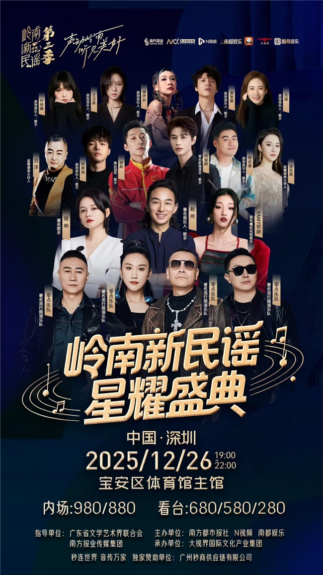 12月26日晚,深圳宝安体育馆星光熠熠,“岭南新民谣·星耀盛典”盛大举行。作为“岭南新民谣·第三季”的年度收官展演,这场由广东省委宣传部重点支持,广东省文学艺术界联合会、南方报业传媒集团指导,南方都市报社、N视频、南都娱乐联合策划主办的音乐盛会,特邀主持人李思颖、吕洋坐镇主持。