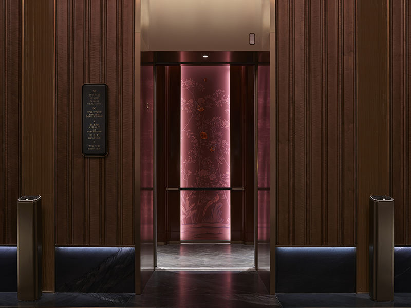 电梯轿厢亦暗藏巧思:灵感源自古典轿辇,以考究的木艺、温润的锦缎和精巧的真丝刺绣,复刻出那份独有的尊贵与仪式感,于起落之间,尽显现代东方的匠心风骨。
