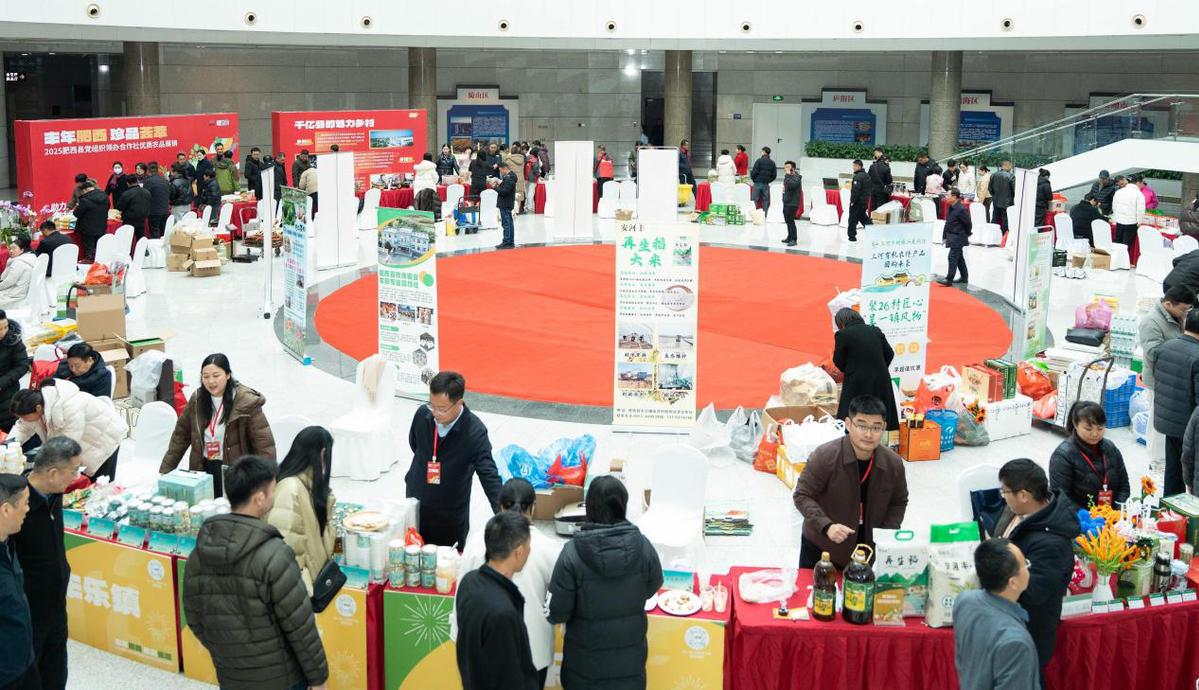 2025年12月23日,为期两日的肥西县村党组织领办合作社优质农产品展销活动在安徽合肥市政府阳光大厅内举办。来自肥西县12个乡镇,30家党组织领办合作社及农业企业的百余款特色农产品通过“现场选购+线上下单”的方式,让市民在家门口就能置办一桌地道的“肥西年宴”。