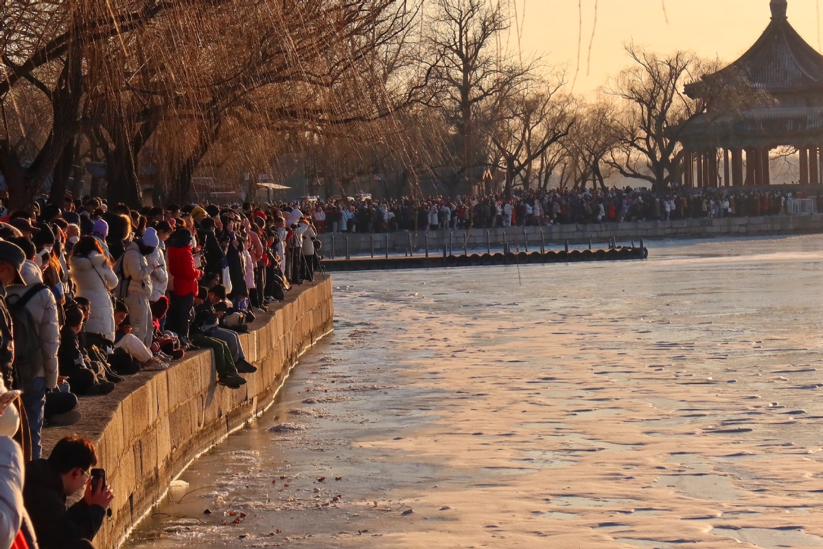12月21日,众多游客和摄影爱好者在颐和园内拍摄十七孔桥“金光穿洞”美景。中国日报记者 姜东 摄