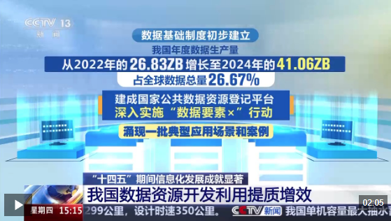 5年来,我国数据资源开发利用提质增效,年度数据生产量从2022年的26.83ZB增长至2024年的41.06ZB,占全球数据总量26.67%。另外,我国信息化应用水平大幅提升,建成全国政务服务“一张网”,92.5%的省级行政许可事项实现网上受理和“最多跑一次”。