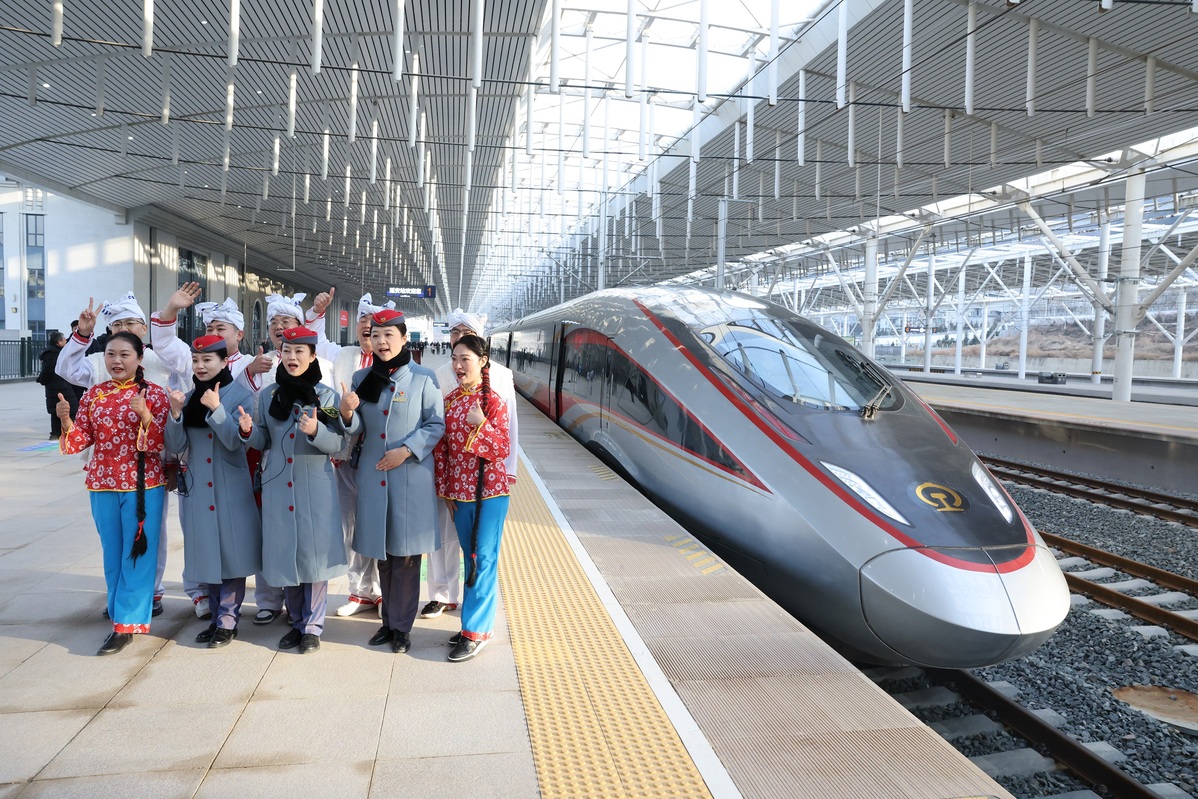12月26日,乘坐西延高铁首发列车的乘客在延安站站台合影留念。中国日报记者 王敬 摄