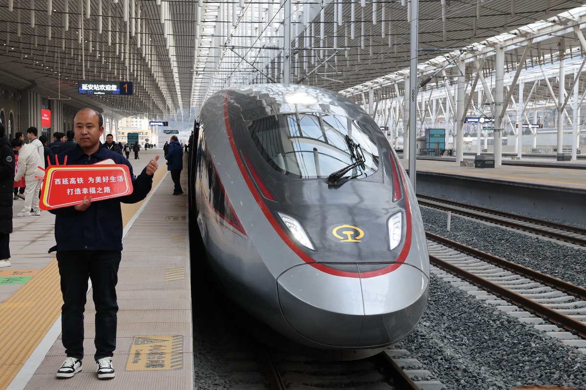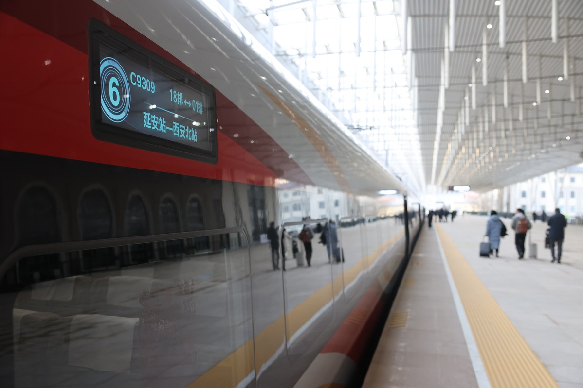 12月26日,乘客在延安站登上西延高铁首发列车。中国日报记者 王敬 摄