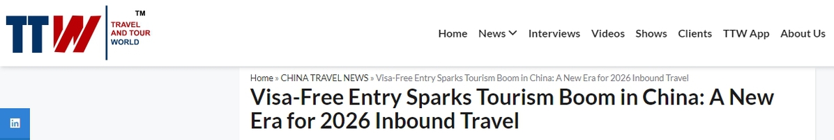 中国日报网1月16日电 2026年开年,中国入境游迎来强劲开局。数据显示,多地旅游目的地客流均呈现显著增长,适用免签政策入境的外国人达到29.2万人次,较去年同期增长35.8%。国际旅游行业媒体《旅行与旅游世界》网站(Travel And Tour World)持续关注中国蓬勃发展的旅游市场并在近日的报道中表示,在免签政策红利加持与国际连通性不断提升的双重推动下,中国的旅游格局正经历深刻转型,这一上升趋势亦凸显出中国作为全球旅游目的地的吸引力日益增强。