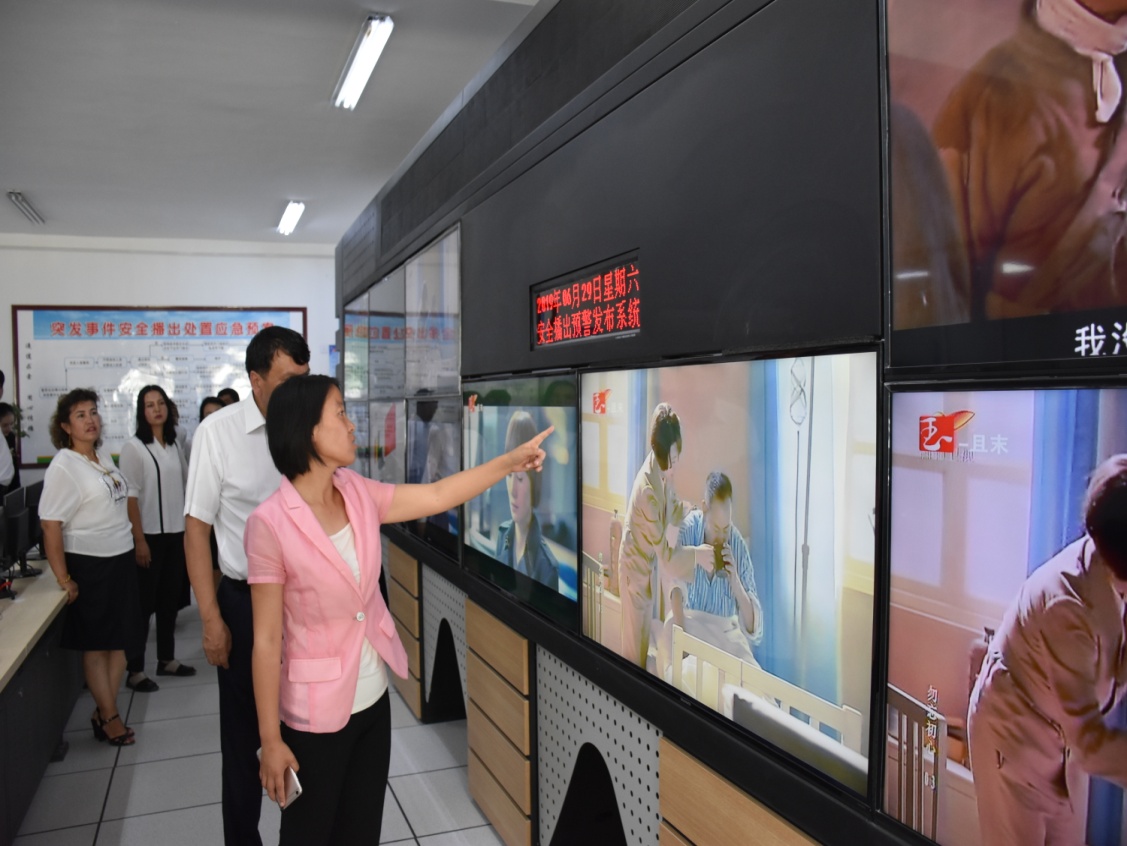 6月29日,且末县委常委、宣传部长许晓华等正在且末县电视台播控中心查看机房设备运转情况。