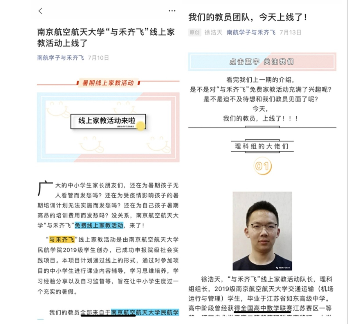 为了解决并帮助在这一个特殊暑假期间的小孩学习问题,日前,如东籍南京航空航天大学民航学院2019级交通运输专业学生徐浩天与同学们发起并创办了一个名为“与禾齐飞”的线上公益家教帮扶活动,活动成员们采取线上授课的方式,用腾讯会议的形式来对小学及初中的孩子进行直播授课,并且“一家一策”制定不同家庭的服务方案,为孩子们提供重难点知识讲解、作业辅导、交流陪伴、才艺辅导等方面的帮扶交流,获得家长们一致好评。截至发稿前,“与禾齐飞”帮扶实践活动报名的志愿者共计15人,细心辅导约55位小学和初中的学员,授课时长逾200小时。