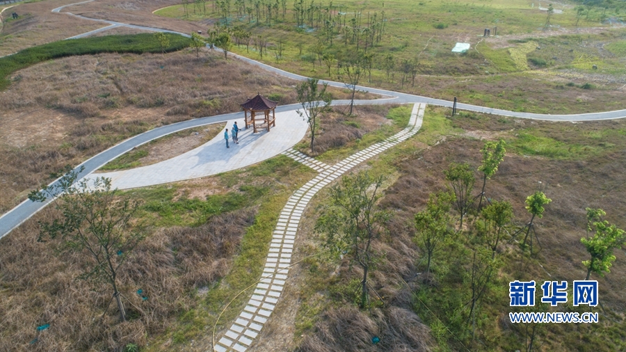 这是红庙岭一期垃圾卫生填埋场生态修复工程,昔日垃圾填埋场如今已成生态绿地(无人机照片)。新华网 肖和勇 摄
