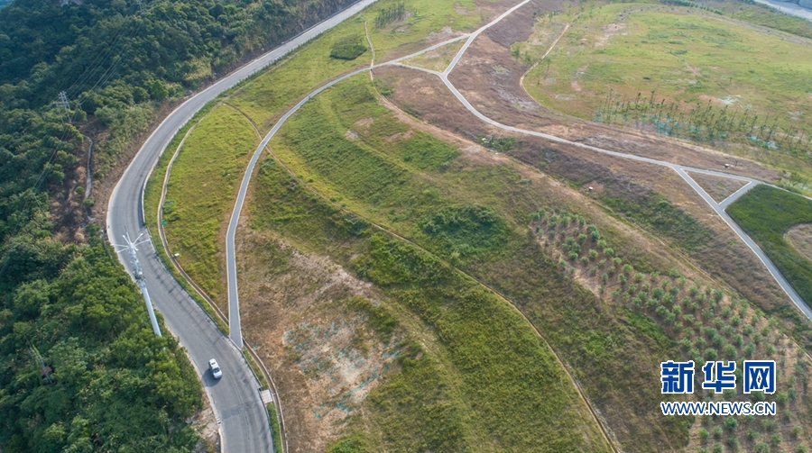 这是红庙岭一期垃圾卫生填埋场生态修复工程,昔日垃圾填埋场如今已成生态绿地,周边是一二期、三期垃圾焚烧发电厂,远处是福州市城区(无人机照片)。新华网 肖和勇 摄