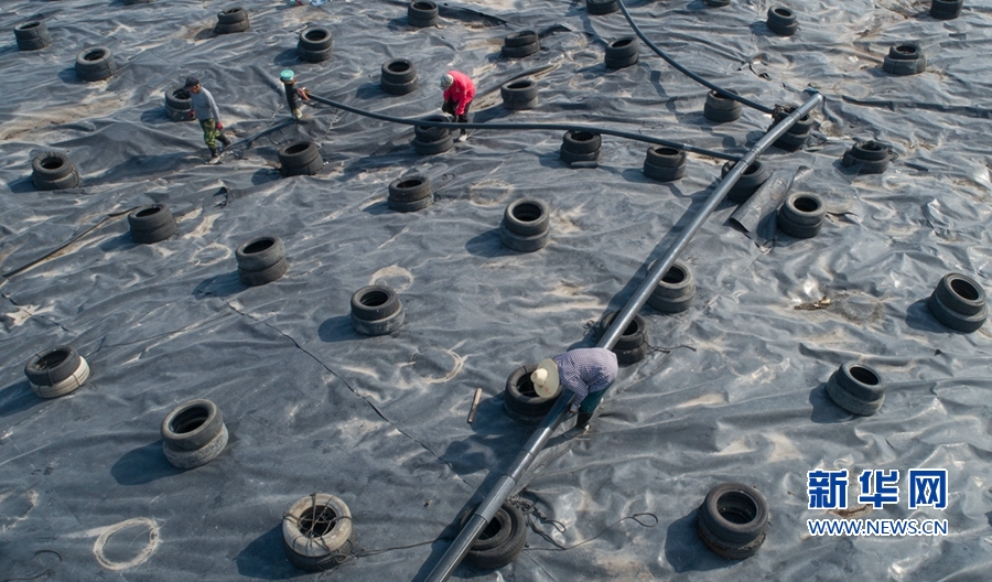 这是红庙岭二期垃圾卫生填埋场,工人正在检查沼气收集管道(无人机照片)。新华网 肖和勇 摄
